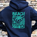 Beach Vibes Hoodie — retro palm & hibiscus back-print pullover. Unisex heavy‑blend sweatshirt in White, Sand, Light Blue, or Navy — cozy coastal style for beach lovers.