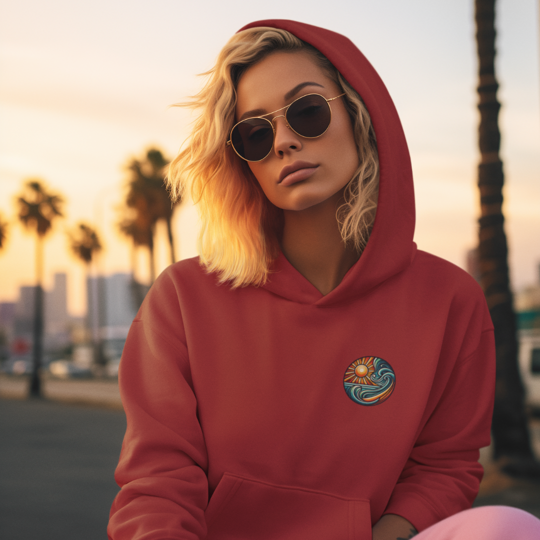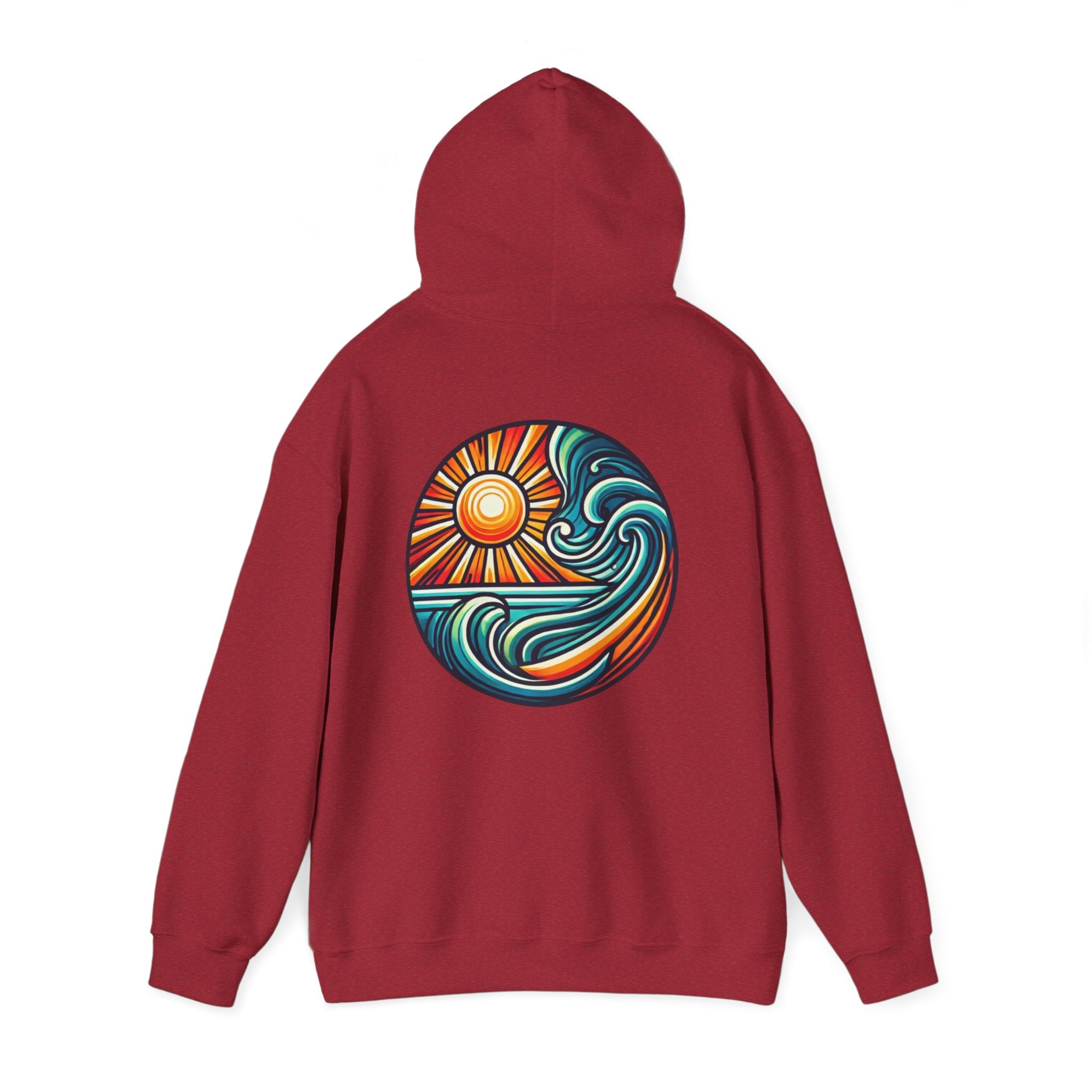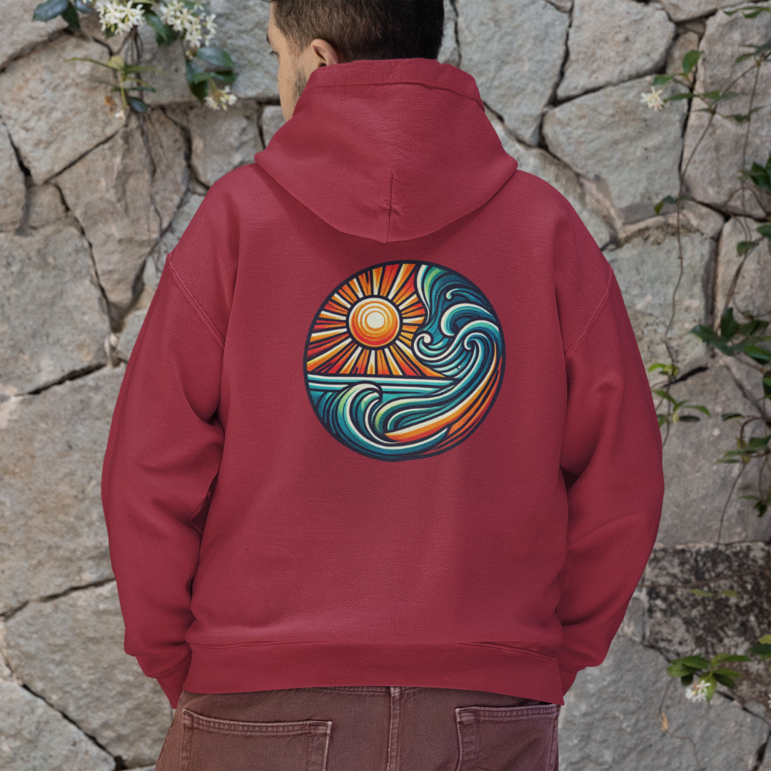 Stay cozy and stylish in this sunset wave graphic hoodie, perfect for beach lovers, surf fans, and anyone who dreams of golden hours by the ocean. The vibrant sun and swirling wave design featured on both the back and left chest makes this unisex red hoodie a standout piece for sunset chasers and artistic souls.