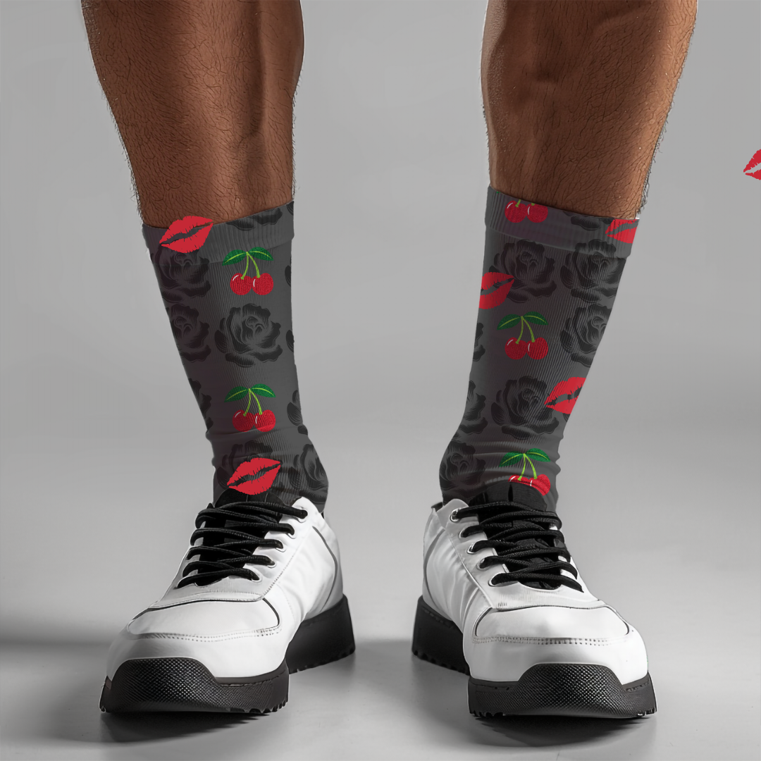 Make your Valentine’s Day extra special with these romantic cherry and rose socks! Perfect for couples, these festive socks feature a unique lips design alongside cherries and roses on a sleek black background.
