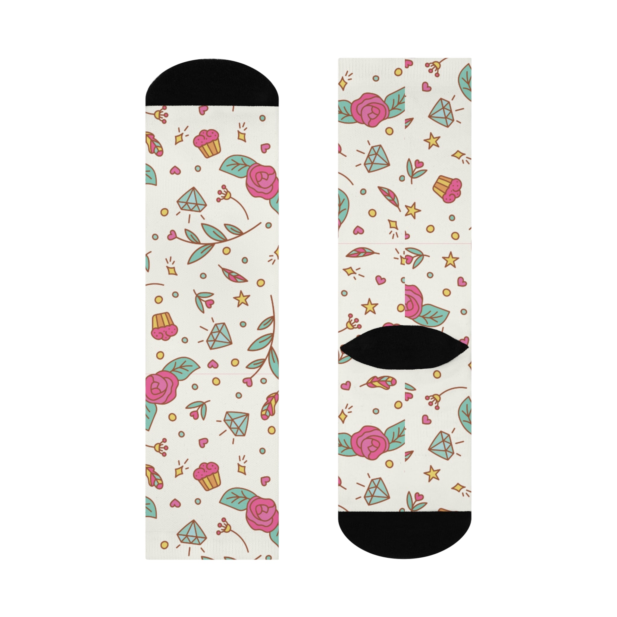 Designed in collaboration with influencer Hollywood Betty, this exclusive collection is perfect for confident, unique individuals who embrace both femininity and gothic style. These socks feature an enchanting pattern of cupcakes, diamonds, hearts, and flowers on a soft white background, making them a standout addition to any wardrobe.