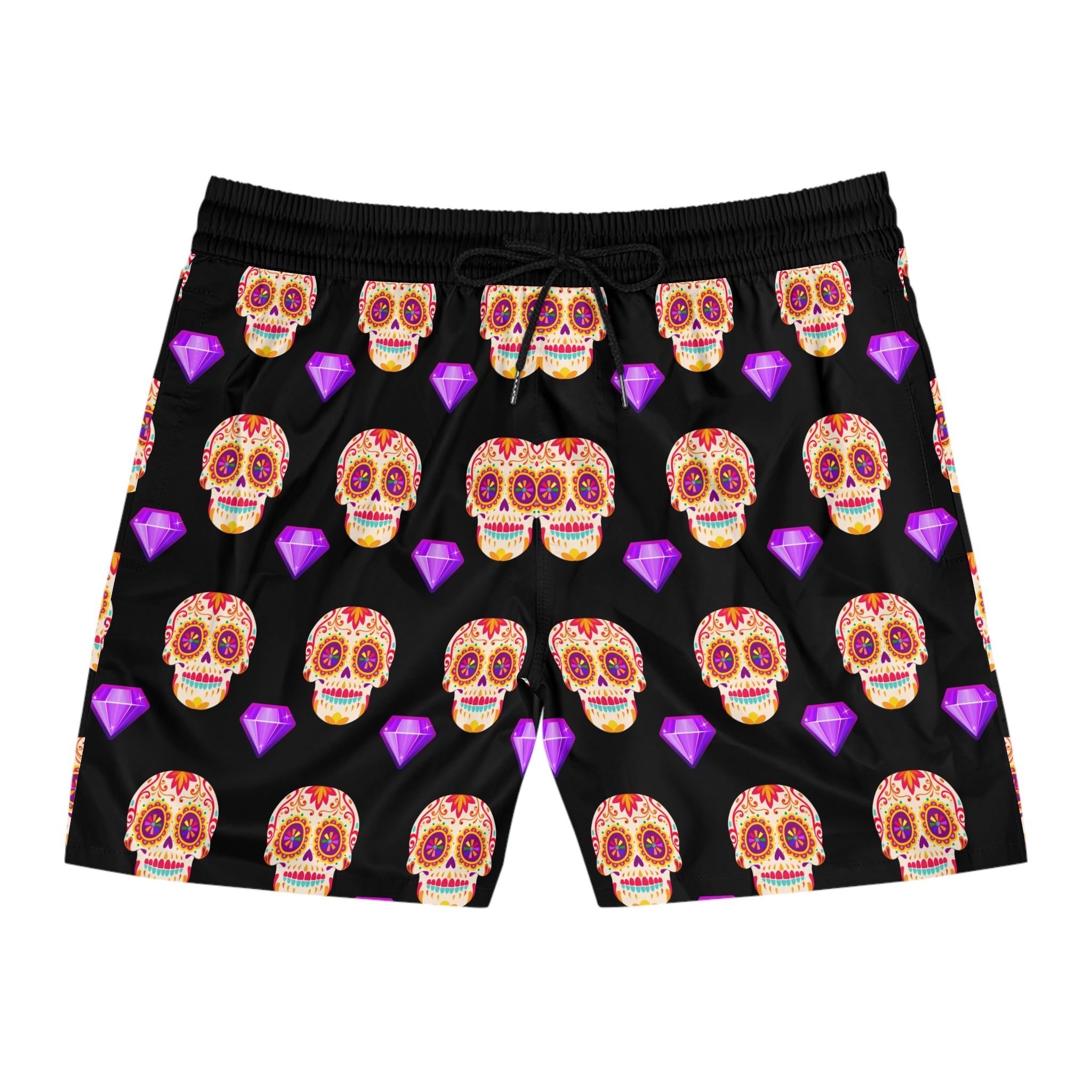 Bring the party to the pool with these sugar skull swim shorts for men, featuring a bold mix of neon diamonds and festive skulls