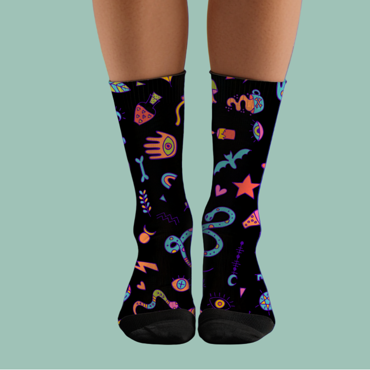 These Neon Gothic Socks are part of the exclusive Hollywood Betty Collection, designed for confident individuals who embrace both feminine and gothic style. Featuring a bold black background adorned with neon stars, snakes, and gothic symbols, these cushioned crew socks make a striking fashion statement for both women and men.