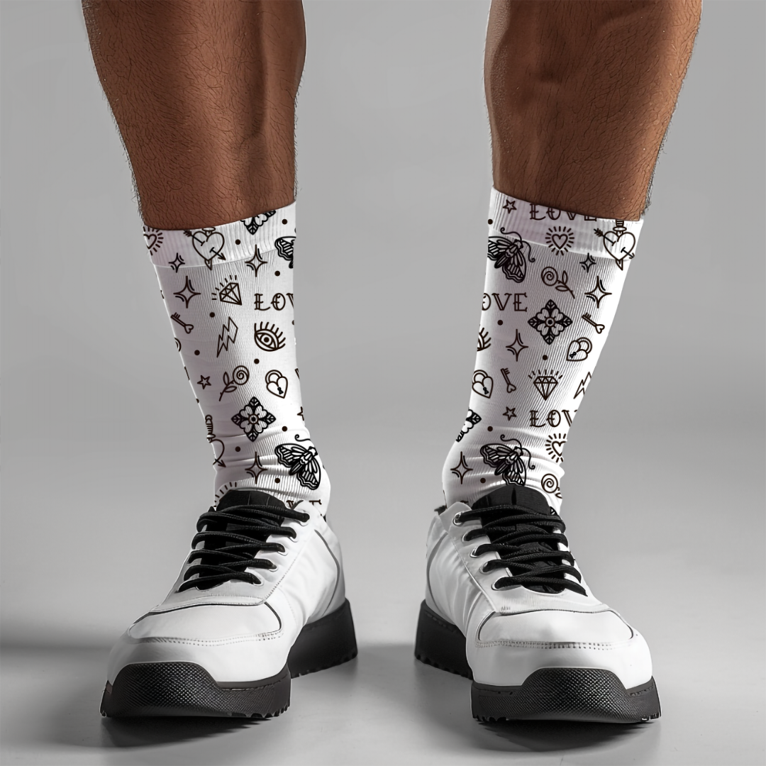 Bring instant attitude to your look with these Old School Tattoo Socks. Featuring a bold black tattoo flash design—including daggers, hearts, diamonds, eyes, and lightning bolts—printed on a clean white base with contrasting black heels and toes, these socks blend retro tattoo art with modern comfort.