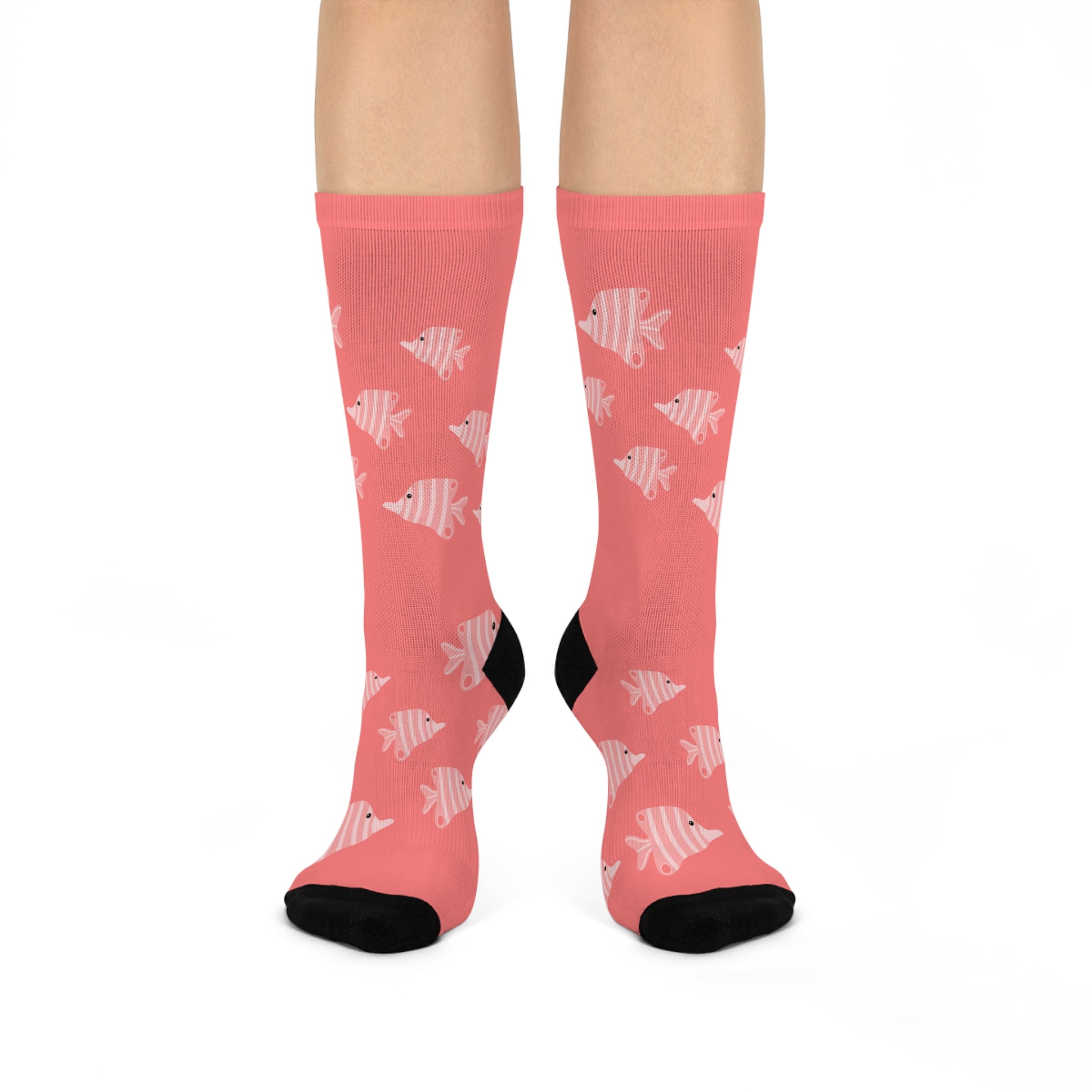 Step into playful style with these Pink Crew Socks with Cute Little Fishy Print—ideal for yourself or as a gift for ocean-loving friends!