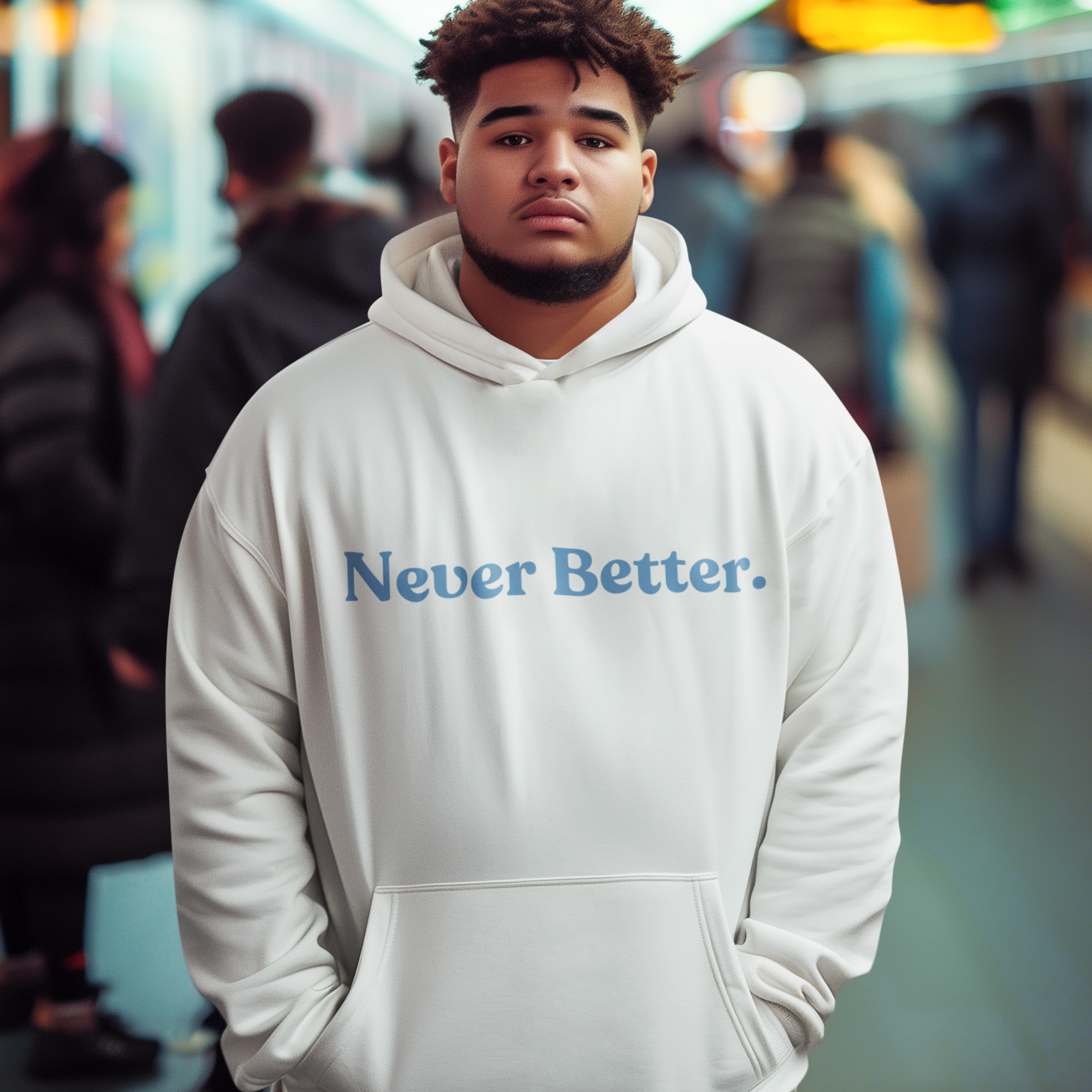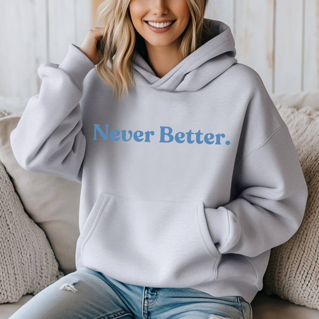Spread positivity in style with the Positive Vibes Ash Gray Hoodie. Featuring the uplifting “Never Better” graphic on the front, this unisex hoodie combines cozy comfort with a bold, cheerful statement. Its soft ash gray tone makes it versatile for casual wear, layering, or gifting to someone who loves good vibes and effortless style.