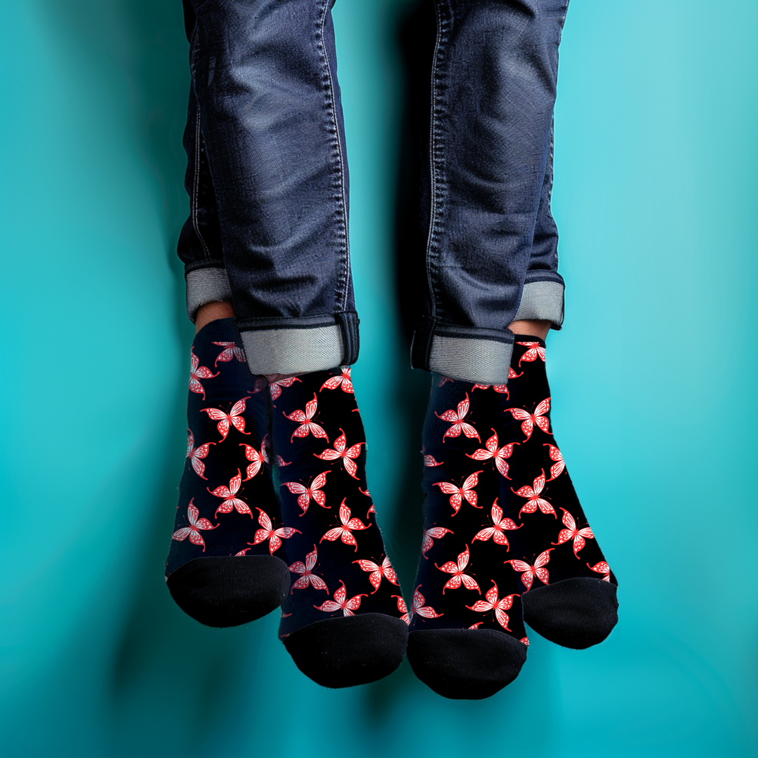 These Butterfly Print Socks combine edgy and sweet style. Featuring a bold red butterfly pattern on a sleek black background, they’re perfect for butterfly enthusiasts, goth fashion lovers, or anyone wanting to elevate their sock collection.