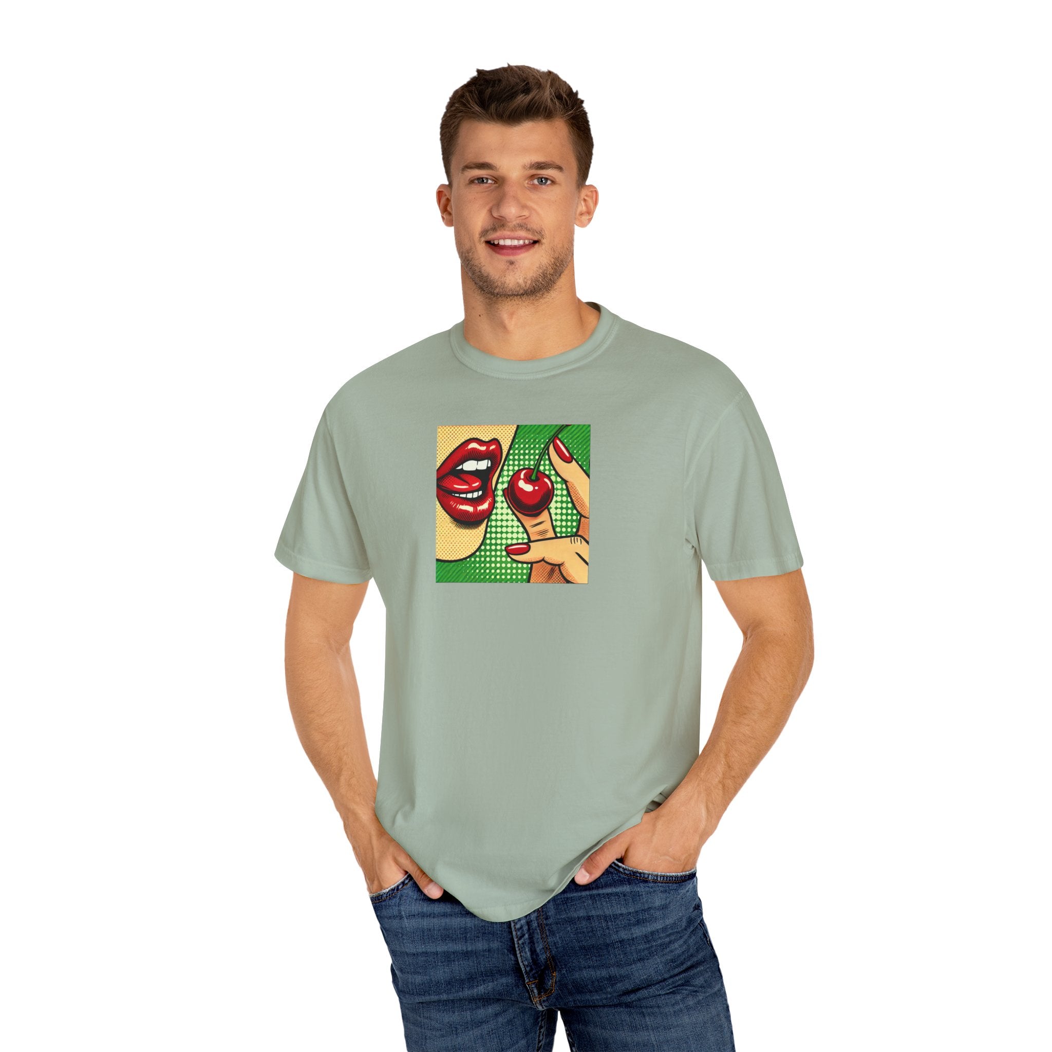 The Retro Pop Art Shirt features a bold red lips and cherry design in high-contrast retro comic style. This colorful, cheeky graphic shirt is designed for women and men, blending streetwear edge with vintage pop art vibes for a striking, eye-catching piece.