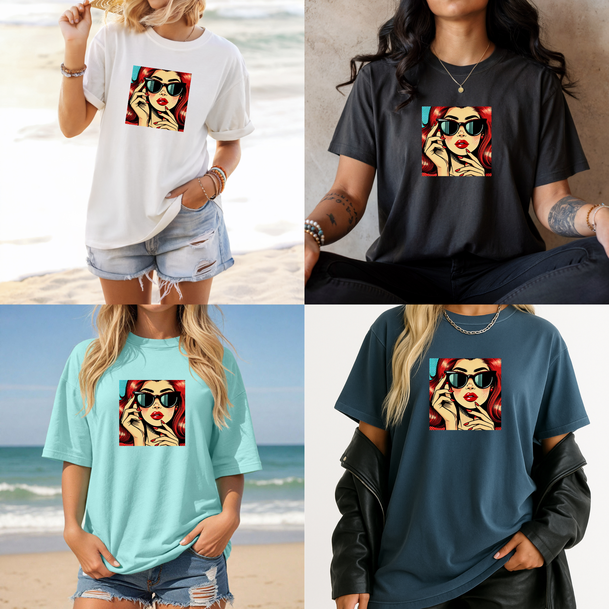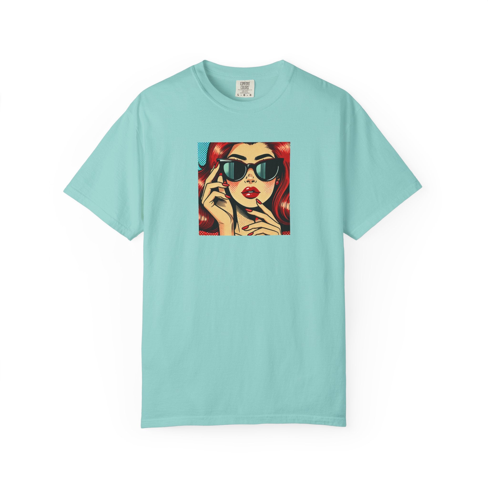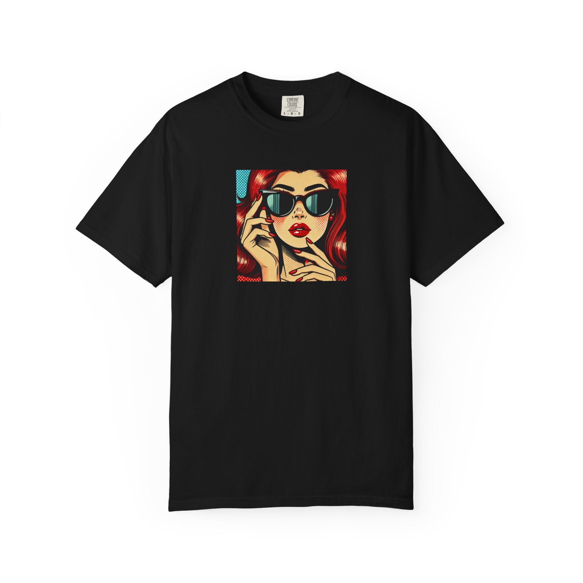 This Pop Art Shirt embodies pure cool-girl energy: a retro redhead adjusting her cat-eye sunglasses, bold red lips, and classic comic halftone detailing in vibrant colors. Perfect for people who wear confidence as an accessory, this shirt combines vintage flair with street-ready style. Printed on soft, breathable cotton with a unisex fit, it’s ideal for skaters, vintage lovers, and anyone looking to make a statement. Pair with ripped jeans, layer under a moto jacket, or dress it up with your favorite streetwear pieces — this shirt does all the talking.
