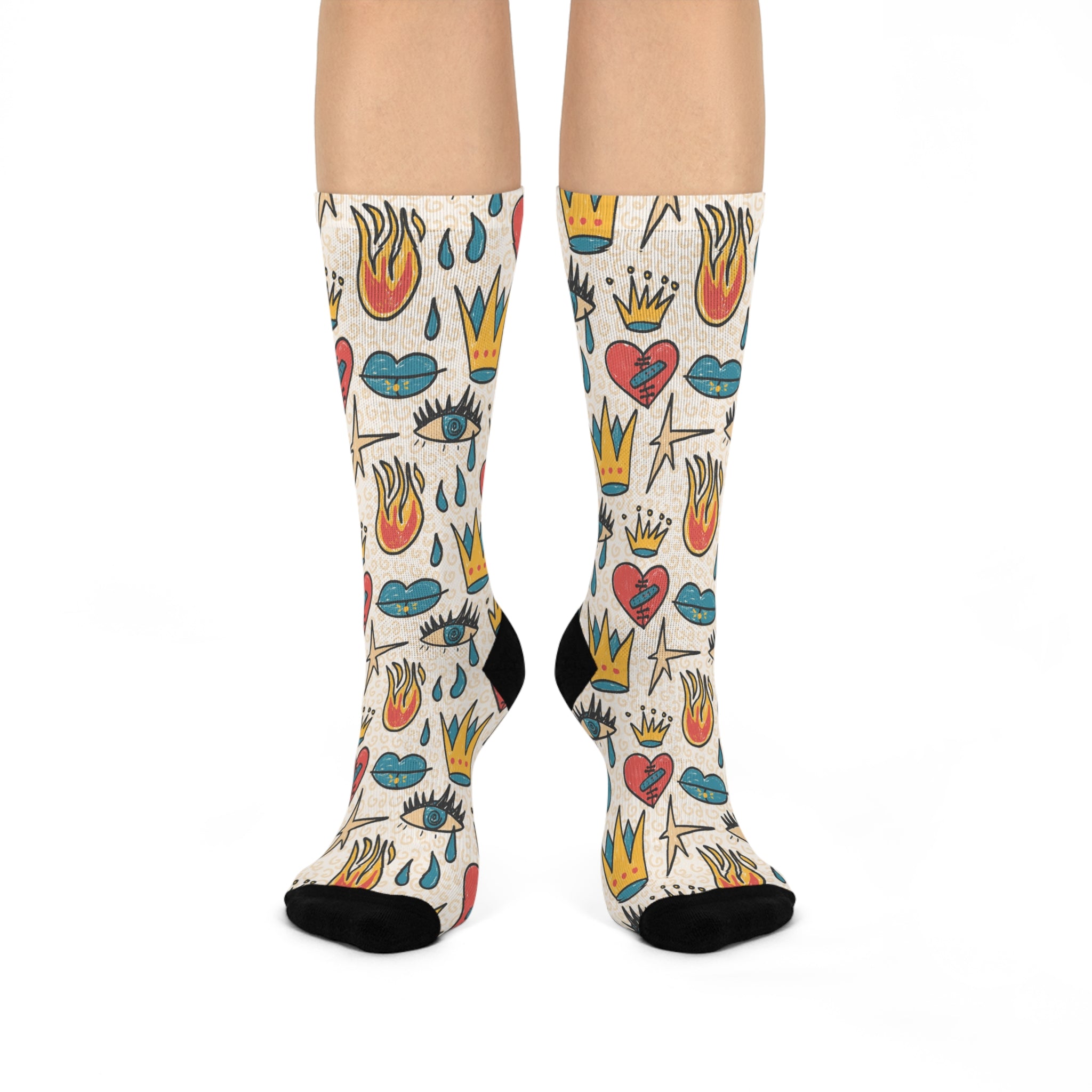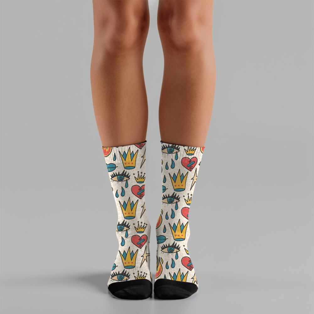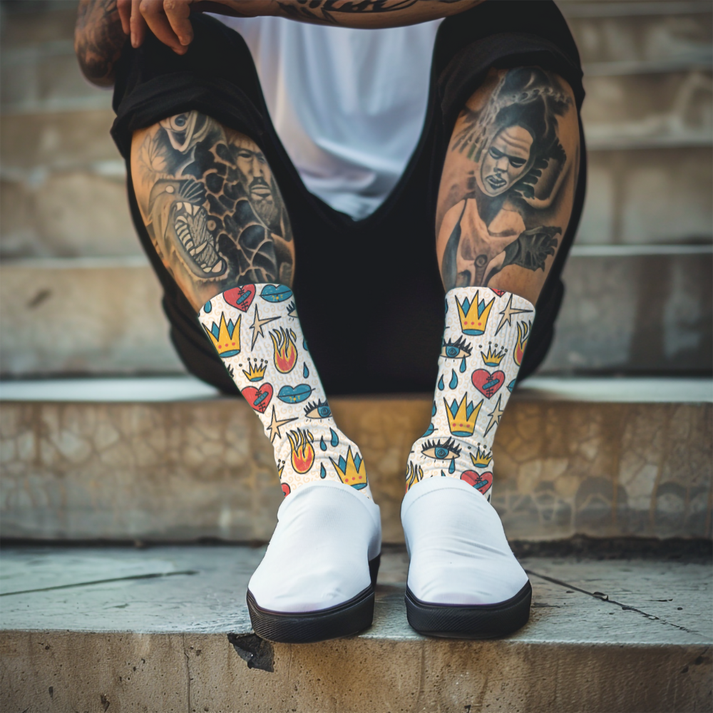 These Pop Art socks bring bold ink-inspired energy to your everyday look. Covered in retro-style designs like hearts, flames, crowns, eyes, and stars, they’re perfect for tattoo fans, alternative fashion lovers, and anyone with a rebellious streak. These unisex crew socks deliver comfort and creativity in one killer package.