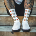 These retro tattoo socks feature classic swallow and heart art for a bold, ink-inspired look. With a rockabilly flair, these fun novelty socks are perfect for tattoo fans, alternative fashion lovers, or anyone who likes to step out in statement socks.