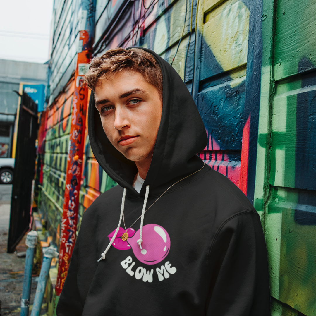 Make a bold statement with the Sarcastic "Blow Me" Hoodie. This black unisex hoodie features a cheeky bubble gum graphic paired with a playful phrase on the front, perfect for anyone with a sense of humor who loves quirky, conversation-starting fashion.