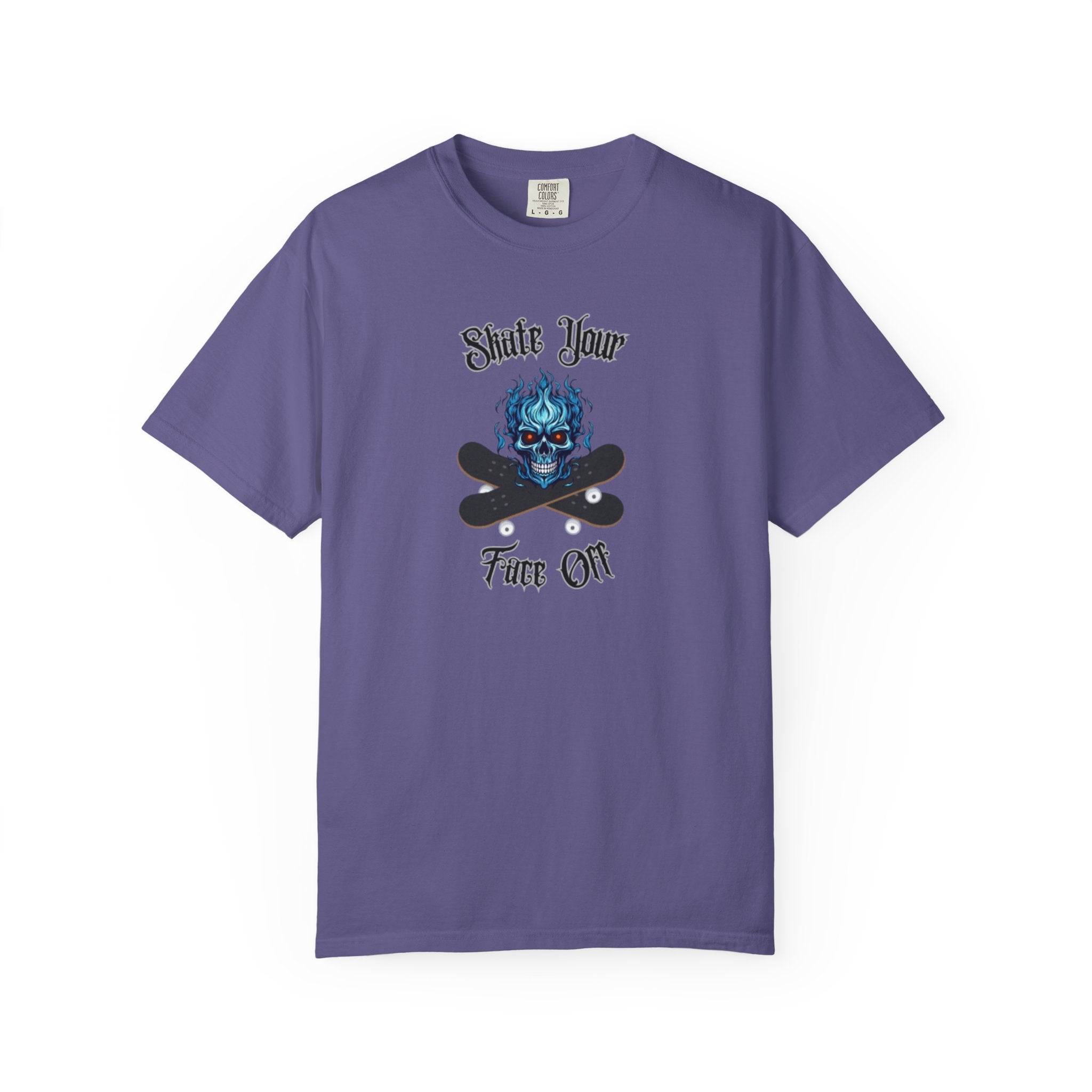 Upgrade your skateboarding wardrobe with this Comfort Colors purple Skate T-Shirt. Featuring a bold skull and skateboard graphic, this vintage-inspired design blends grunge, retro aesthetics, and streetwear style. Perfect for skaters, alternative fashion fans, and anyone looking for a standout graphic tee, it pairs effortlessly with baggy jeans, hoodies, or layered outfits.
