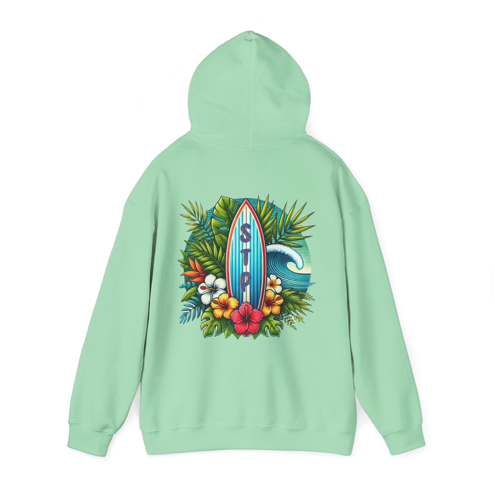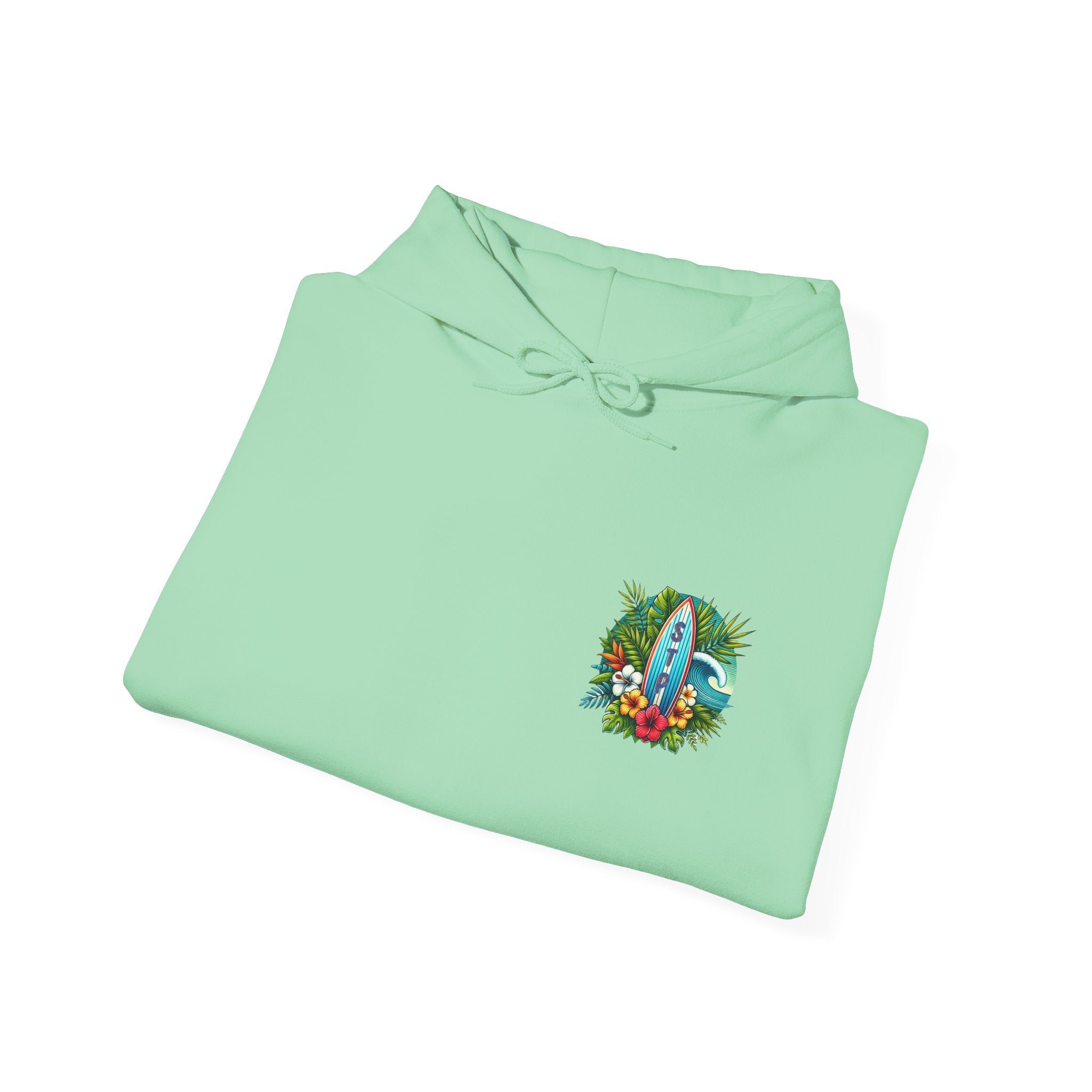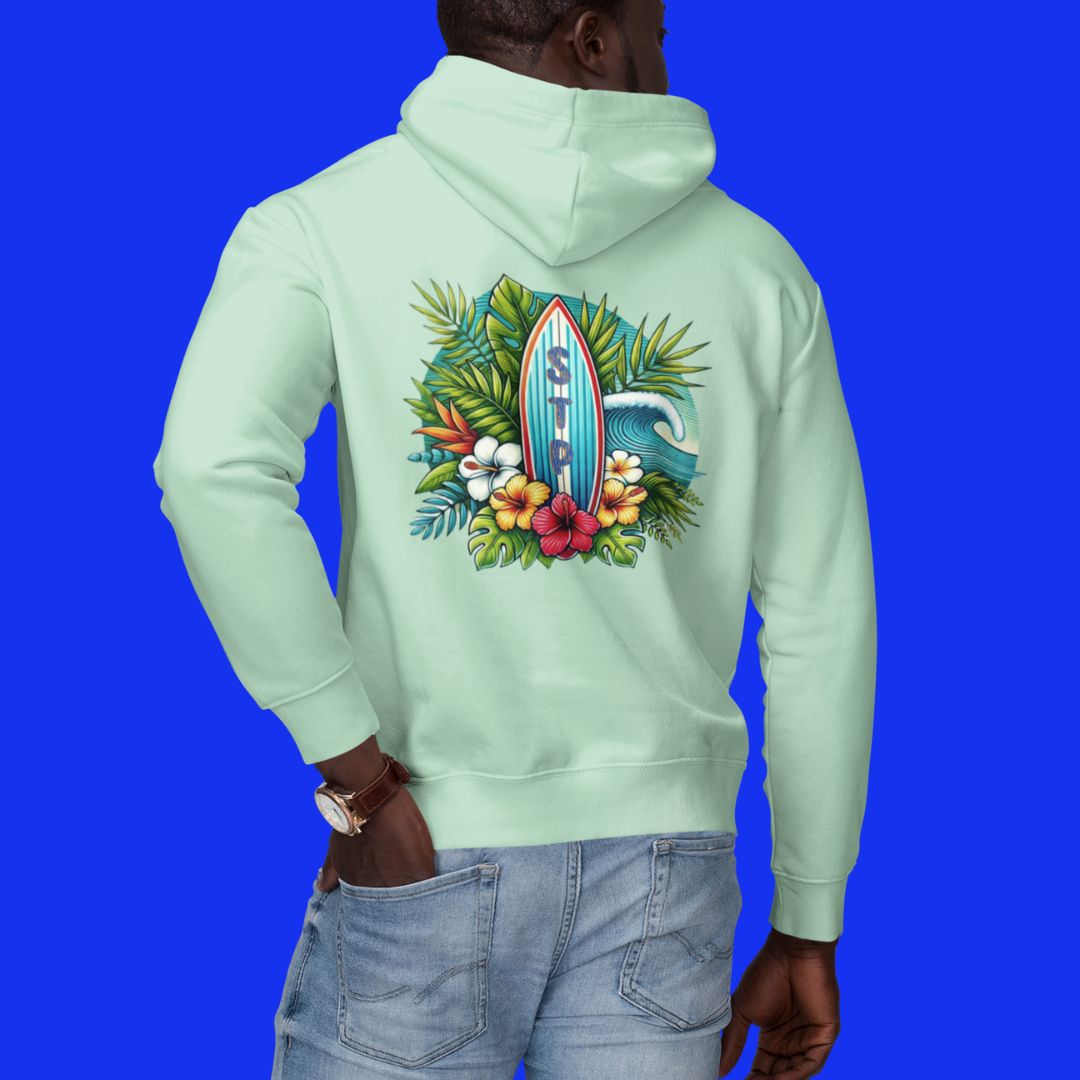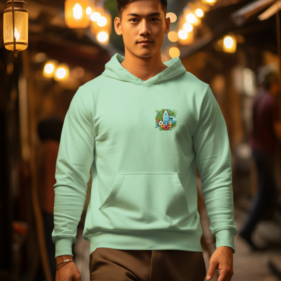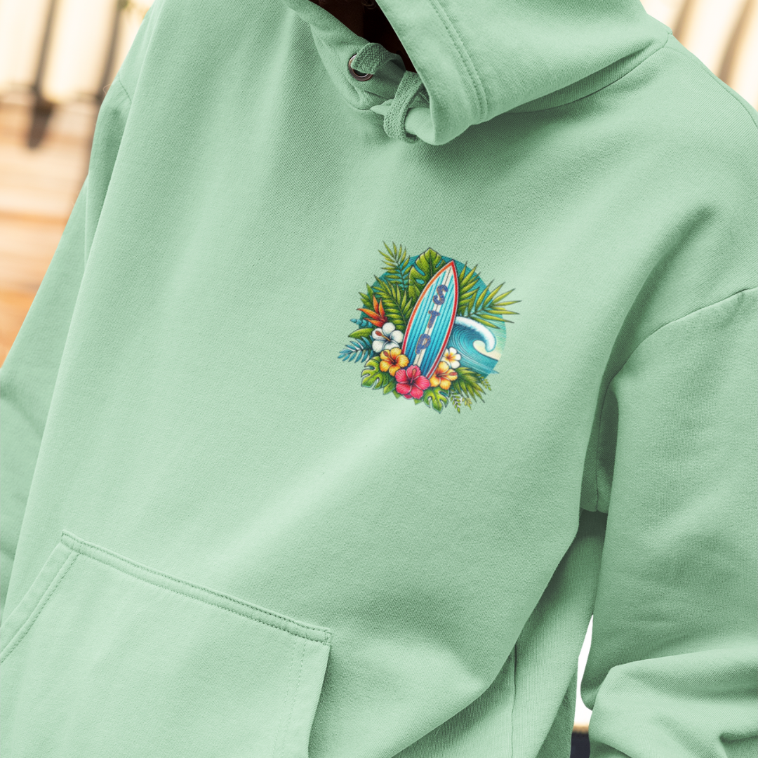Bring the beach vibes wherever you go with the Surfboard Design Hoodie. Featuring a vibrant surfboard and tropical flower graphic on both front and back, this mint green unisex hoodie blends coastal style with cozy comfort. Perfect for surfers, beach lovers, or anyone who enjoys casual, stylish looks.